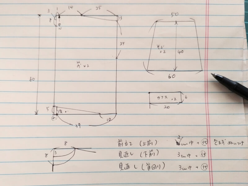 ここからこんな感じかな〜と考えて作ってみたラフな製図がこちらです。サイズ表を参考にしながらテキトーに。