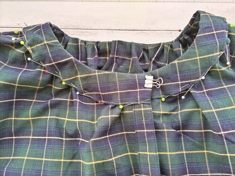続いては襟周り。まずは身頃の首回りにギャザーを寄せたら、そこにペタッとした襟を仮留め。丸いから、マチ針で留めまくり。