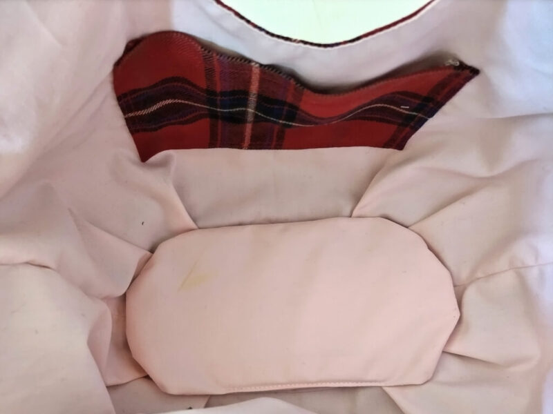 内側には、制作工程には書いてないけど、小さなポケットをつけました。あと底板も入れました。底板があるので、少々重いものを入れても、バッグ底がたわまない。