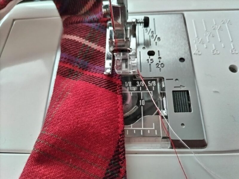 持ち手部分は、外側になる方は端まで縫っちゃう。内側になる方は10cmほど縫わずにおきます。