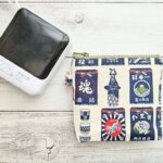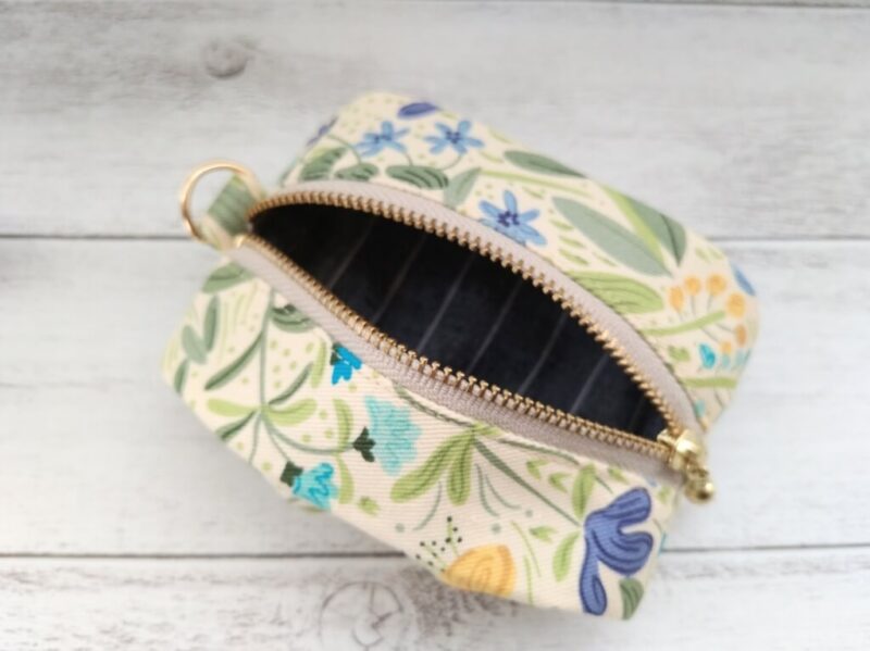 ベージュに大きな花柄で、元気の出るファスナーポーチになりました。こちら、内側は暗くなっちゃったけど、紺に白いストライプの入った生地を使っています。