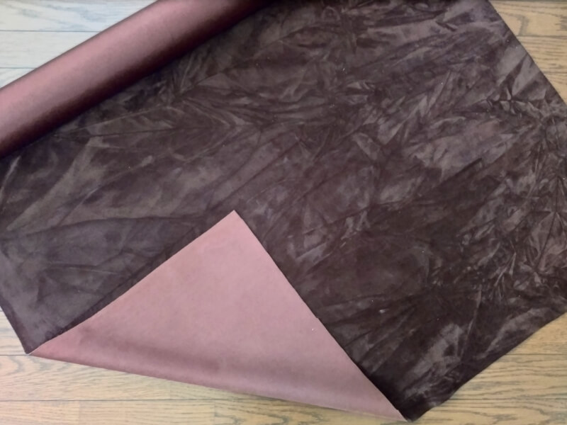 表はレザーっぽい。裏はキルティングみたいにフワッとしてる。接着芯を貼らなくてもしっかりしてるし、何よりとっても縫いやすい生地です。