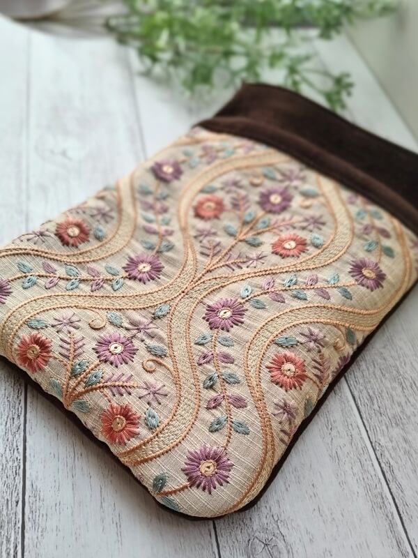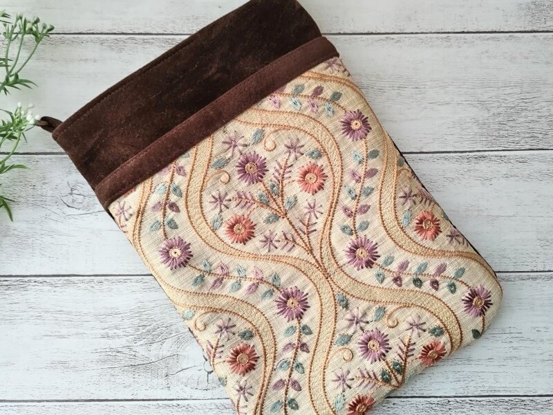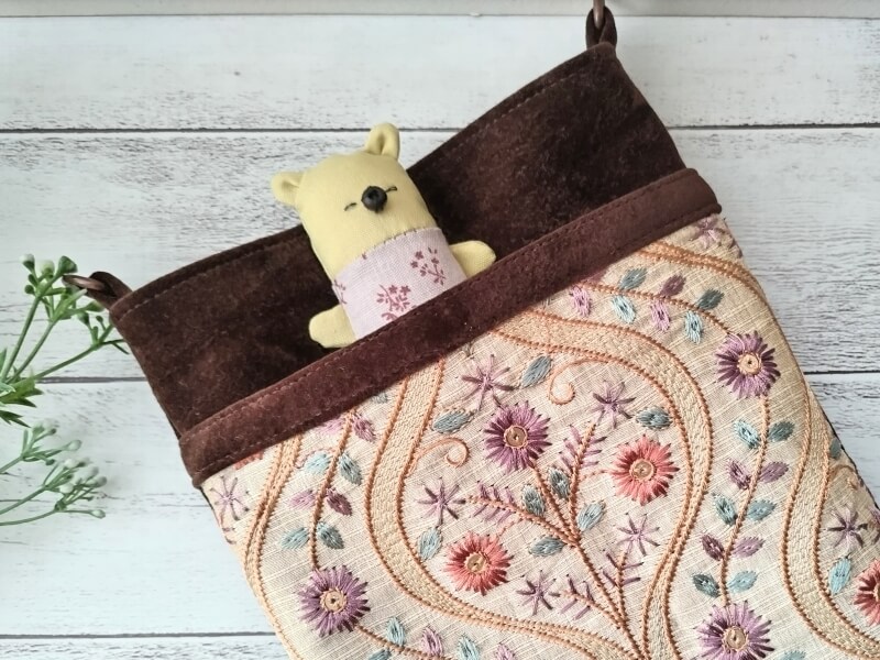 前面のポケットにはインド刺繍の布を使っています。何だかちょっと和風の雰囲気のインド刺繍ね。秋って感じもする。