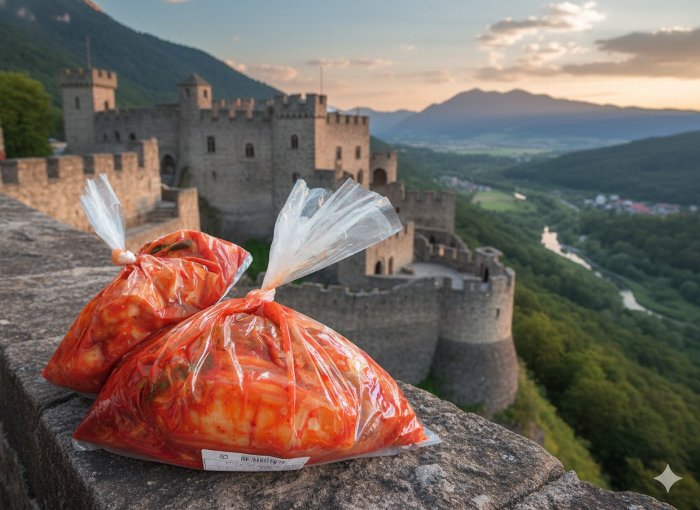 西洋のお城をバックにしたキムチの画像。略して「城キムチ」!