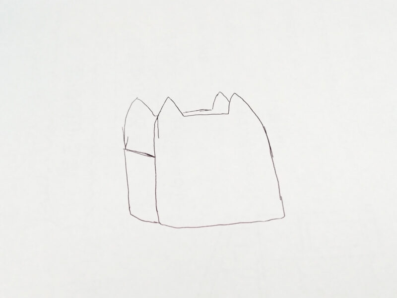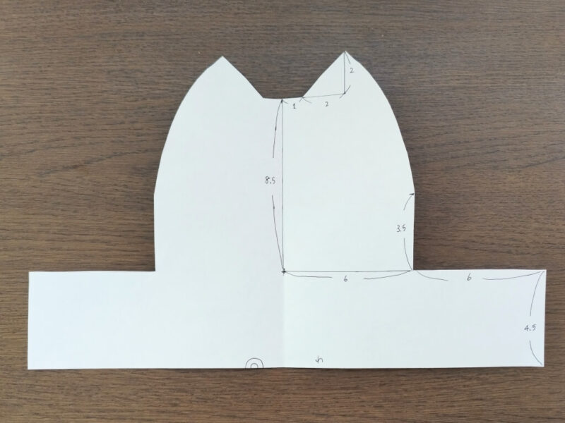 この長方形の部分を、正面と背面のネコちゃんの顔のサイドに合わせます。入れ物の形にしていく。