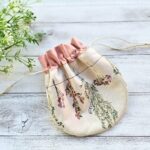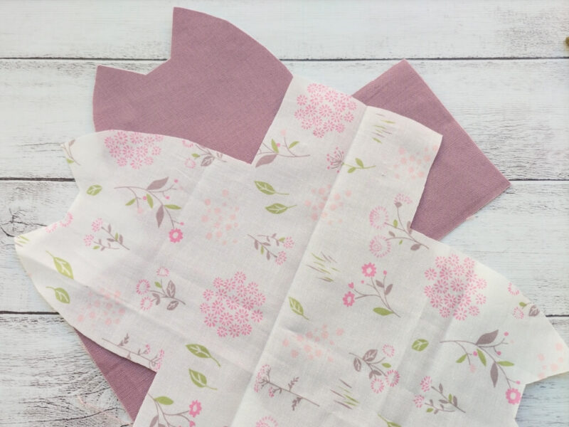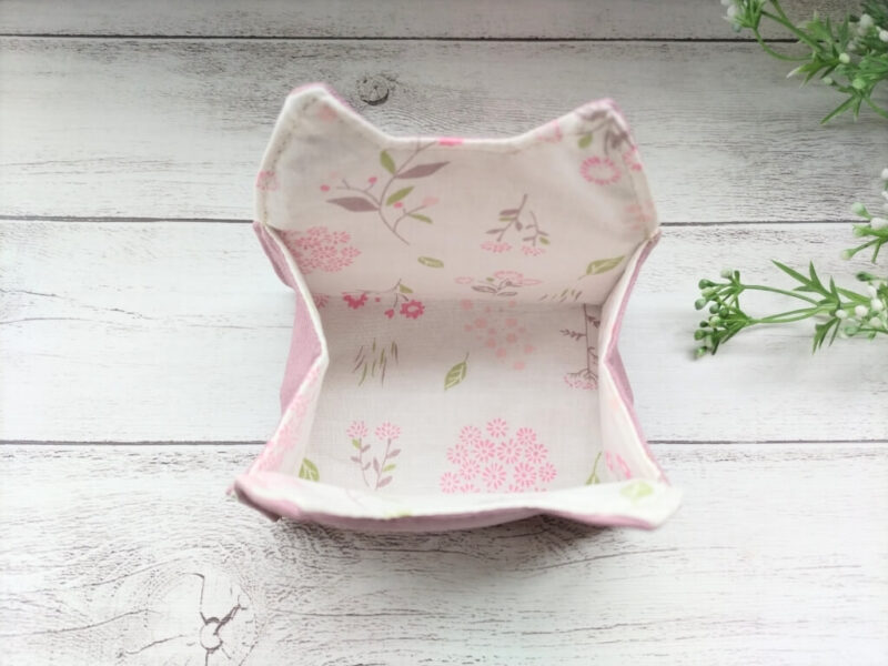 くすみピンクが表地、白にピンクの花柄が内側。ピンクの方は、裏に厚手の接着芯を貼っています。