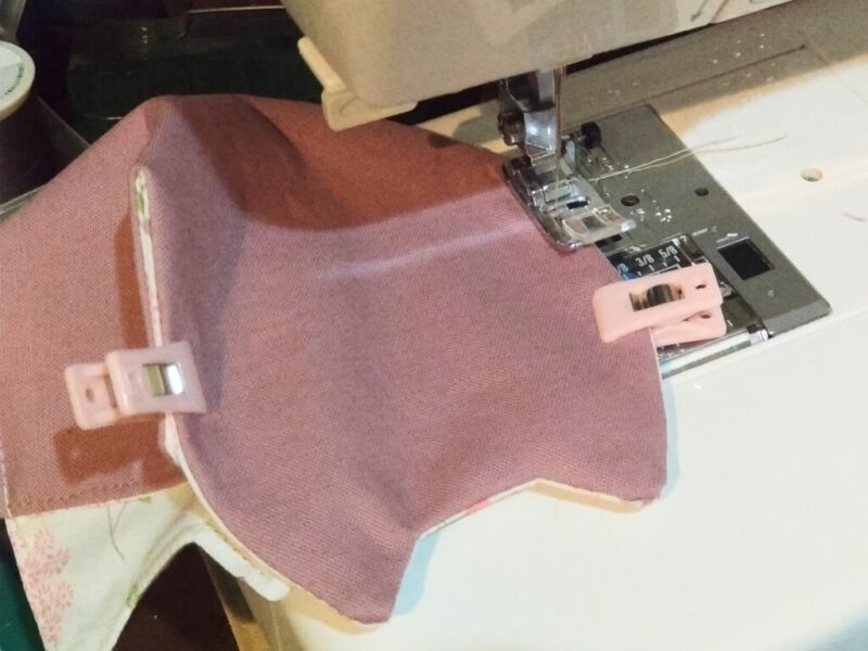 まずは、表布と内布を中表に合わせて、ぐるっと一周縫います。返し口はこの写真の右上の方、直線部分にしました。見えるかな?
