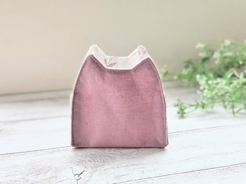 反対側も同様に、底からネコちゃんの耳、頭、反対の耳、そのまま底までを端ミシンです。