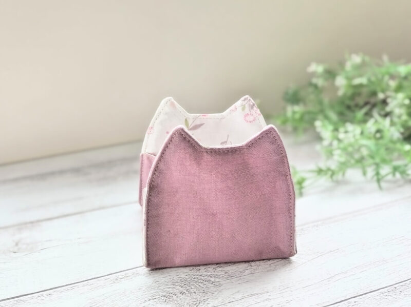 ほい、完成しました! 名付けて「ネコ耳バスケット」です。サイズは、横10cm x 奥行き7cm x 高さ10cmほど。小さな布バスケットです。