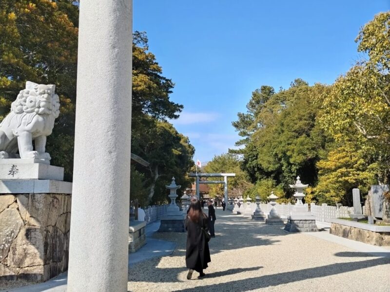 まず向かったのは、「伊弉諾(いざなぎ)神宮」です。淡路島は伊弉諾尊(いざなぎ)と伊弉冉尊(いざなみ)の二柱の神様が作った、日本列島の最初の島とされます。その二柱を祀った神社。
