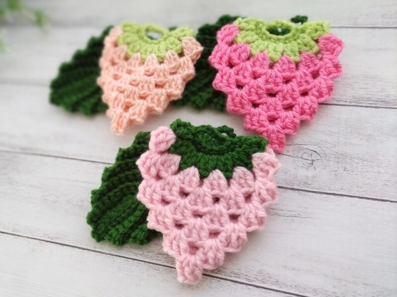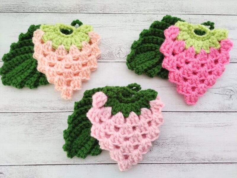 イチゴと葉っぱのアクリルたわしの編み方はこちらに書いてます↓。慣れてくると、編むのが遅い私でも、30分もあれば編めるようになったよ。