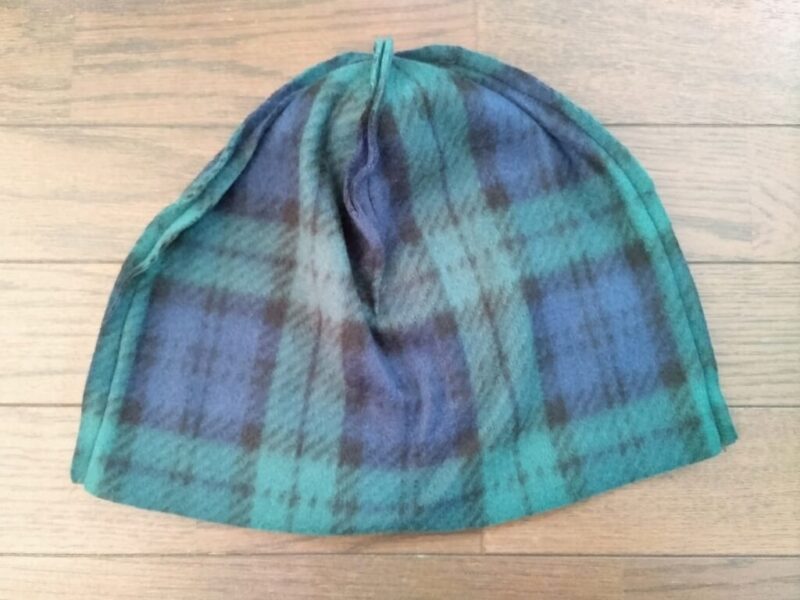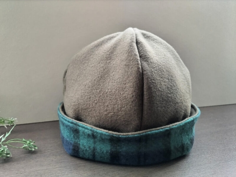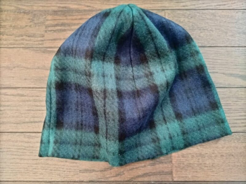 完成した帽子、ブラックウォッチ柄とオリーブの組み合わせが本当に可愛いです。