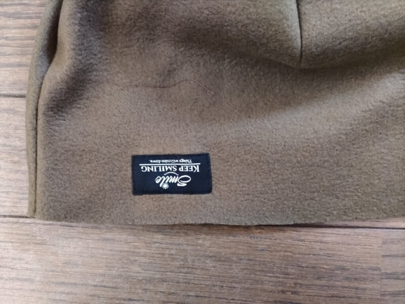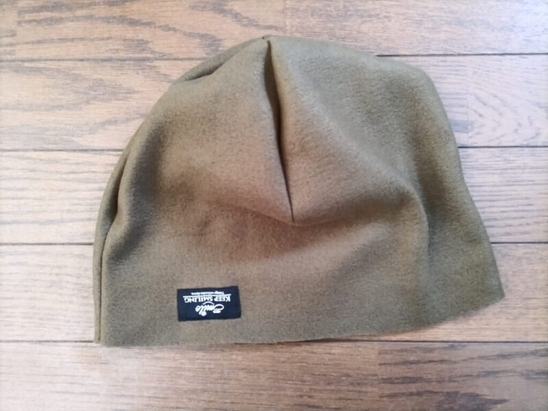 内側のオリーブ色を外にしても被れます。リバーシブルに使える。こっちだと、いろんな服に合わせやすそうかな。